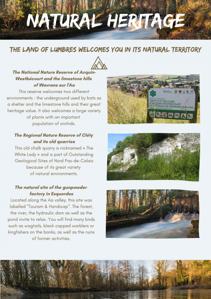 Le Pays de Lumbres vous ouvre son territoire nature avec la Réserve Naturelle Nationale des Grottes et des Pelouses d’Acquin-Westbécourt et des Coteaux de Wavrans-sur-l’Aa, la Réserve Naturelle Régionale des Anciennes Carrières de Cléty ou encore le site de la Poudrerie d’Esquerdes. Au cœur du Parc Naturel Régional des Caps et Marais d’Opale, partez à la découverte de ces lieux naturels uniques !